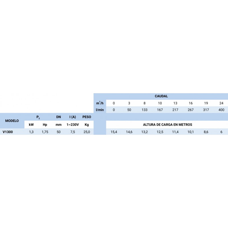 Materiales de construcción Cuerpo de bomba e impulsor en fundición de hierro. Eje en acero inoxidable AISI 304. Doble cierre mecánico Carb/Sic. con cámara de aceite interpuesta. Longitud de cable 10 m.