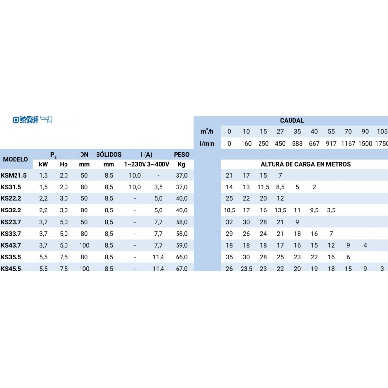 KSM21.5 monofásica, resto de modelos trifásicos. Todas incorporan sonda de protección térmica y sensor de nivel